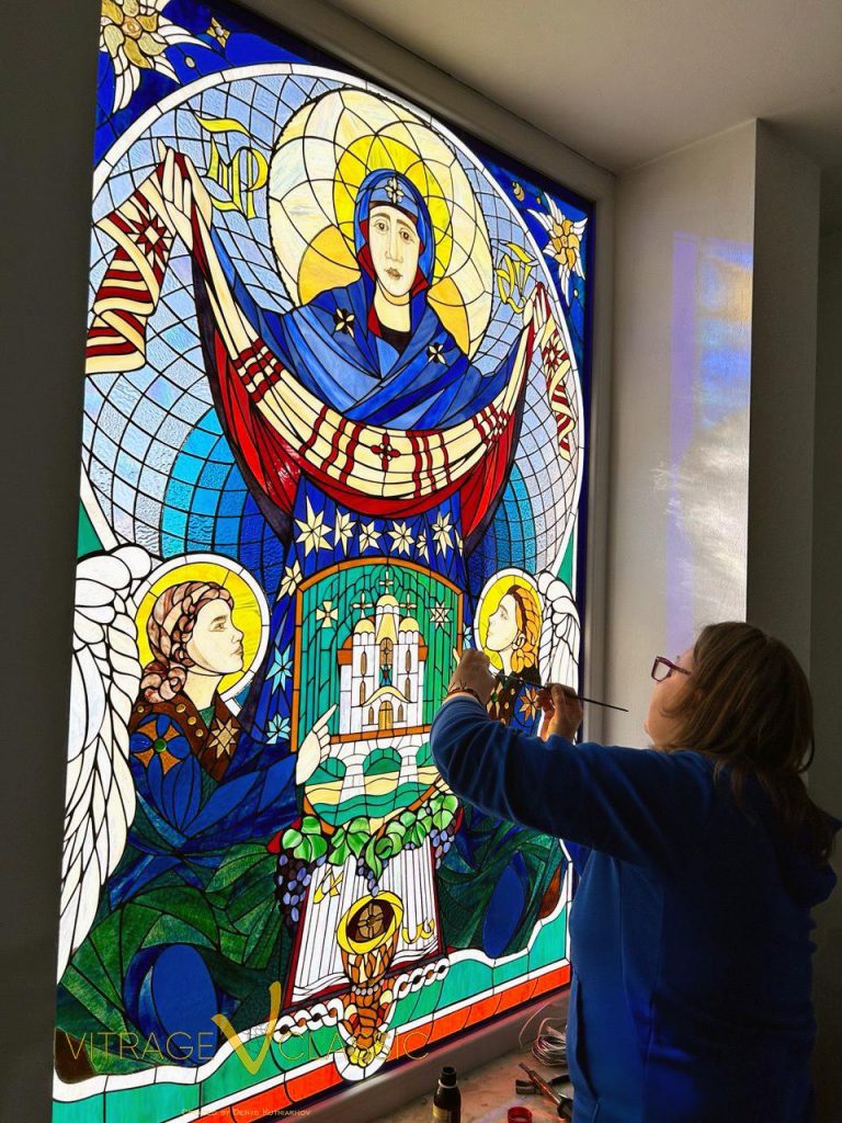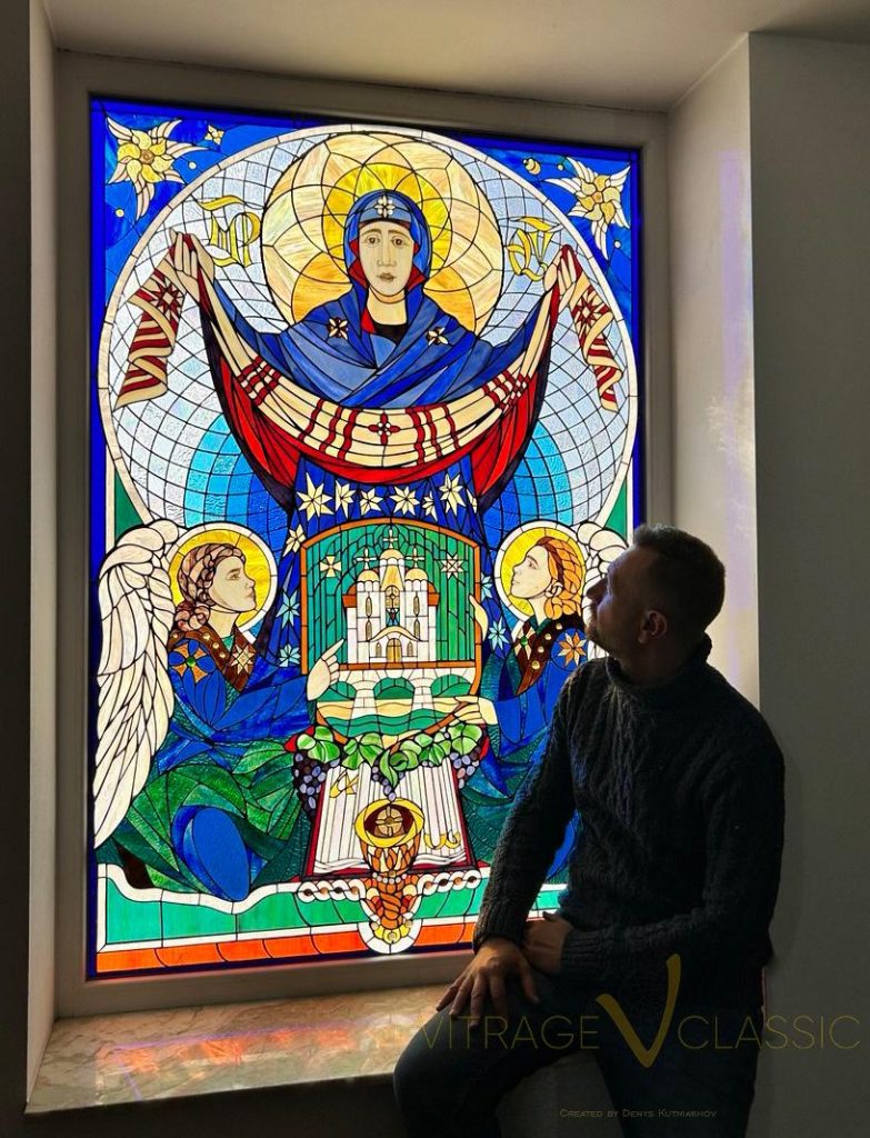 У своїй роботі Денис Кутняхов використовує техніку класичного, паяного вітража з гравіруванням та специфічними прийомами автора, які нагадують 3D ефект, тисячі окремих скляних елементів, виготовлених вручну майстрами студії Kutenglass Concept, об’єднуються у цілісний художній образ за допомогою олов’яного паяння. Фігуративна композиція з Богородицею Орантою у центральній частині, яка розкриває руки у традиційному жесті заступництва та молитви. Її постать, виконана у характерній для іконопису манері, але з виразною графічністю ліній та площинною передачею об’єму, домінує над простором.