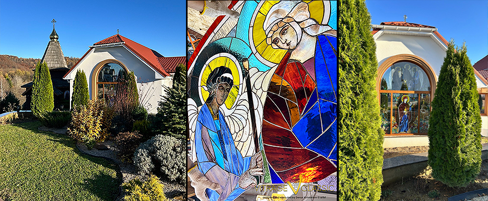 Вітражне вікно у трапезній Свято-Маріє-Магдалинівського жіночого монастиря Цей проєкт 2025 року у Свято-Маріє-Магдалинівському монастирі, демонструє, як монументальне мистецтво може інтегруватися в аскетичний монастирський побут.